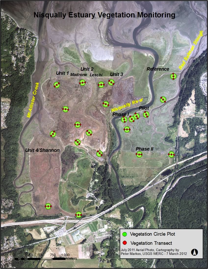 In conjunction with aerial photography, remote sensing, and bathymetry, on-the-ground plant surveys provide information on biological responses to habitat restoration. Vegetation sampling is conducted during summer when vegetative cover is at its maximum. Permanent, 50-m point-intercept transects (1 m intervals) are established to determine the composition, height, and percent cover of plant species and to detect changes in vegetation through time. A 0.25 m2 quadrat is examined at the beginning, middle, and end of each transect (3 quadrats per transect) to estimate mean stem density, height, and ocular estimates of percent cover of each species. The location of target plants or invasive species (such as reed canary grass Phalaris arundinaceae) is tracked with Real-time Kinematic GPS ground surveys or high precision color infrared aerial photographs. Data are used to describe vegetation colonization and establishment (species composition, % cover, height, and density) compared to reference and older restorations in the Nisqually Delta.